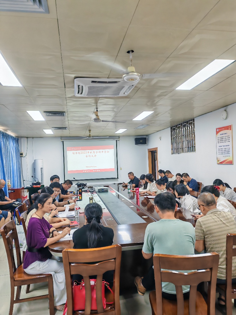 新学期伊始,为确保各项服务工作有序、高效开展,我校图书馆于近日在屏风校区图书馆会议室召开了2025年秋季学期全馆职工会议。会议全面总结了暑假期间以来的工作成果,明确了新学期的工作重点与方向,并就日常安全、节前安全教育、乡村振兴相关活动等事宜进行了专项部署。图书馆全体馆员参加了此次会议。