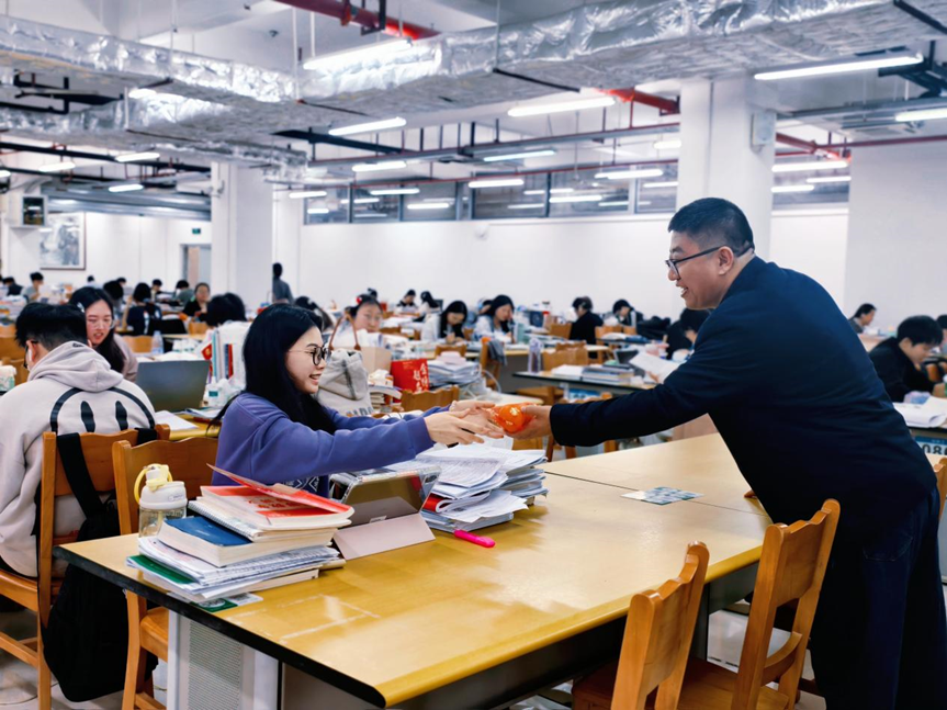12月16日至17日,图书馆领导带领馆员们,分别在雁山馆和屏风馆的考研专用学习室,为正在紧张备考的同学们送上了寓意“心想事成”的橙子、象征“甜蜜顺利”的糖果以及定制祝福卡片等慰问礼品。老师们与学子亲切交流,叮嘱大家保持良好心态,注意劳逸结合,以饱满的精神状态迎接考试,并祝愿每一位同学都能沉着应考、金榜题名。点滴心意,饱含着图书馆对考研学子深深的牵挂与鼓励。