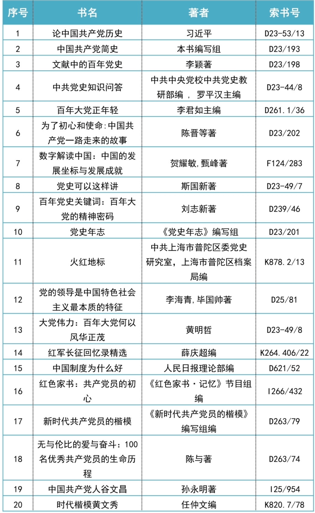 为引导我校读者学史明理、学史增信、学史崇德、学史力行,不断增进对习近平新时代中国特色社会主义思想的政治认同、思想认同、理论认同、情感认同,图书馆特开展“笔写丰功伟绩,书映百年辉煌”好书推荐活动,精选了20本与中国共产党相关的经典力作,满足不同读者的阅读需求,唱响共产党好、社会主义好、改革开放好、伟大祖国好、各族人民好的时代主旋律。