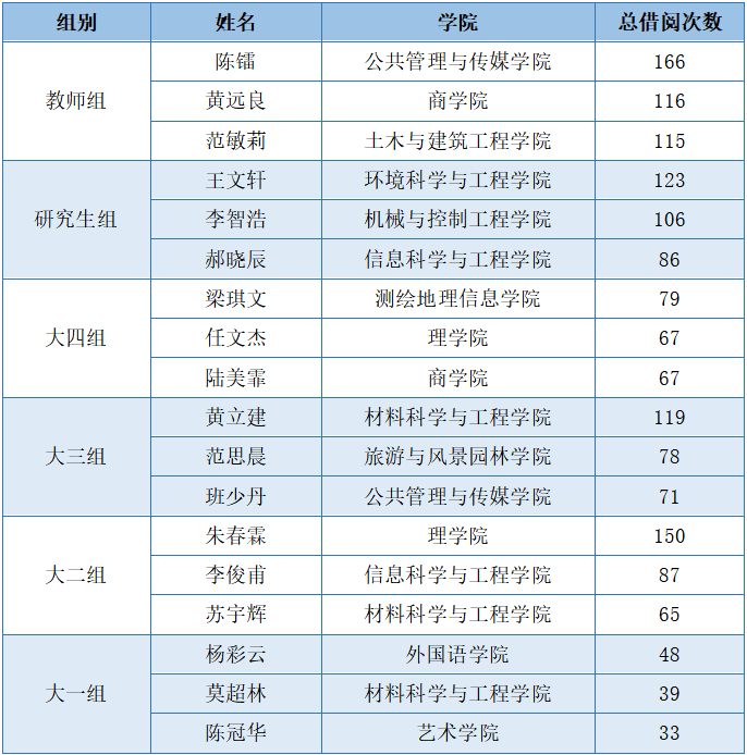 为了吸引更多的读者走进图书馆,倡导读书风尚,弘扬求知精神,塑造良好学风,营造书香校园,图书馆对全校读者2021年图书借阅量进行统计分析,分组评选出18位“读者之星”。评选结果如下:
